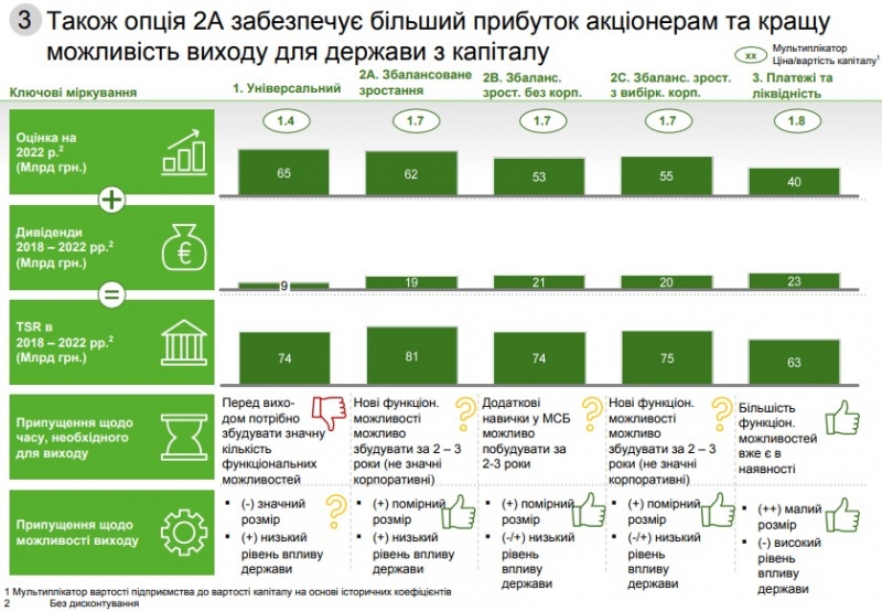В случае реализации этой стратегии стоимость банка к 2022 году составит 62 млрд грн, а мультипликатор продажи - 1,7. Суммарные дивиденды государству до продажи банка могут составить 19 млрд грн за 2018-2022 годы.
