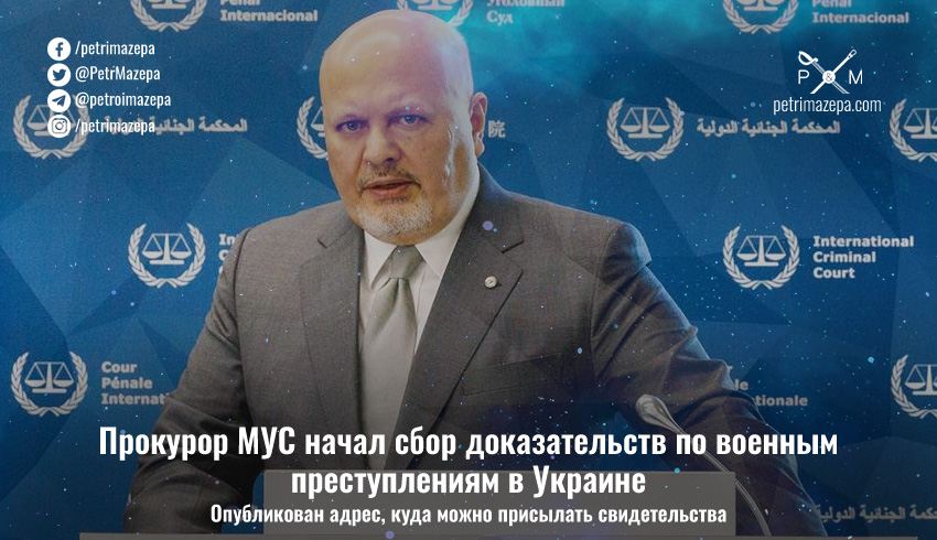 Прокурор Международного уголовного суда (МУС) в Гааге Карим А.А. Хан сообщил, что уведомил Президиум МУС о решении немедленно приступить к активному расследованию ситуации в Украине. Начата работа по сбору доказательств о «военных преступлениях, преступлениях против человечности или геноциде, совершенных на любой части территории Украины. любым человеком».