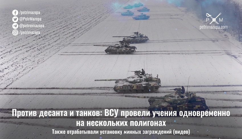 ВС Украины проводят одновременно на ряде полигонов комплексные тактико-специальные занятия по предоставлению отпора условному противнику. Отрабатывают препятствование попыткам прорвать оборону на танкоопасных и десантноопасных участках местности.