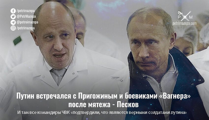 Не прошло и месяца с тех пор как в россии произошел мятеж ЧВК «Вагнер» и главаря боевиков Евгения Пригожина, как пресс-секретарь путина внезапно заявил, что якобы тот проводил встречу с лидерами вооруженного восстания. И там конечно все подтвердили свою личную верность российскому диктатору.