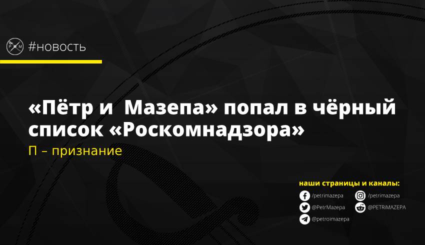 Наш проект «Петр и Мазепа» получил очередное признание на просторах страны-агрессора. Официально, с 15 июля, домен petrimazepa.com находится в черном списке целого «Роскомнадзора» и запрещен на просторах наследницы тюрьмы народов. Соответствующее решение принято Наримановским районным судом Астраханской области по факту публикации материала «УПА и украинская полиция».