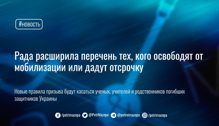 Согласно законопроекту №7352 будет расширен и перечень тех, кому предоставляется отсрочка от призыва. Это ученые, педагоги и научно-педагогические сотрудники, но только при условии, что они работают в научных учреждениях, организациях, учебных заведениях по основному месту работы не менее чем на 0,75 ставки.