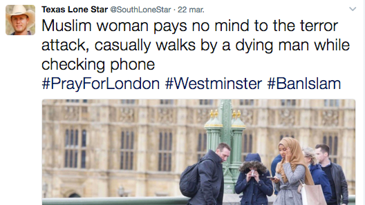 По факту теракта на Вестминстерском мосту в Лондоне, который произошёл в 22 марта 2017 года, в сетях активно распространялось скандальное фото. На нем молодая женщина в хиджабе шла мимо раненых людей, втупившись в телефон. Подпись под ним гласила:  «Мусульманка не обращает внимание на теракт и спокойно себе идет мимо мужчины, который умирает, глядя в свой телефон». Как оказалось – это очередной фейк из РФ.