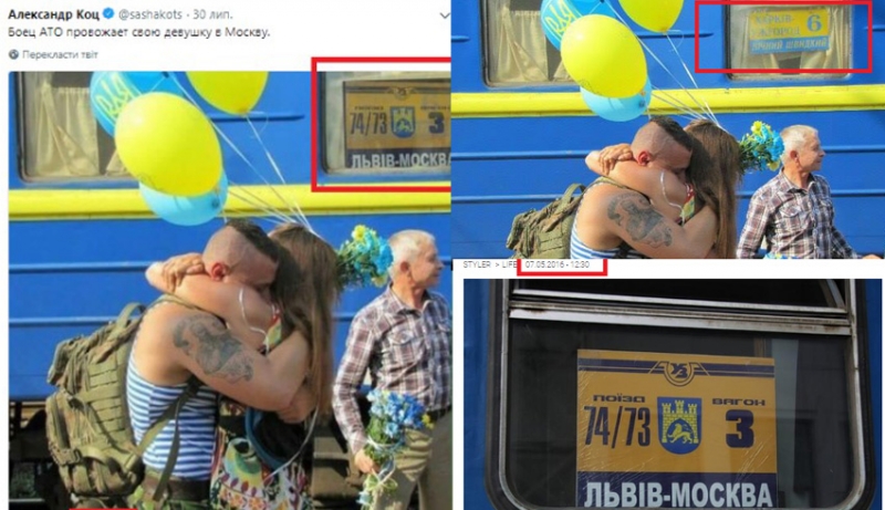 В конце июля российский пропагандист, по какому-то недоразумению именующий себя журналистом, Александр Коц запостил очередной фейк. На фотоколлаже украинский боец обнимает девушку на фоне поезда «Львов-Москва». Естественно столь жирный вброс тут же подхватили как обычные пророссийские пользователи, так и пропагандистские ресурсы.