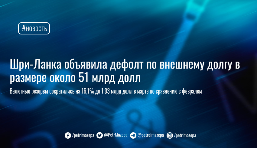 Власти Шри-Ланки объявили дефолт по своему внешнему долгу в размере около 51 млрд долларов в ожидании спасения от Международного валютного фонда. Переговоры с МВФ запланированы на конец апреля. Валютные резервы Шри-Ланки сократились на 16,1% до 1,93 млрд долларов в марте по сравнению с месяцем ранее.