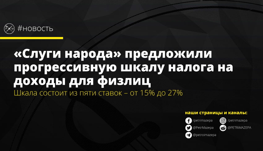 Нардепы фракции «Слуга народа» зарегистрировали в ВР законопроект №3076, предлагающий ввести прогрессивную шкалу налога на доходы физлиц (НДФЛ). Предлагаемая нардепами шкала предполагает пять ставок: 15%, 18%, 21%, 24% и 27%.