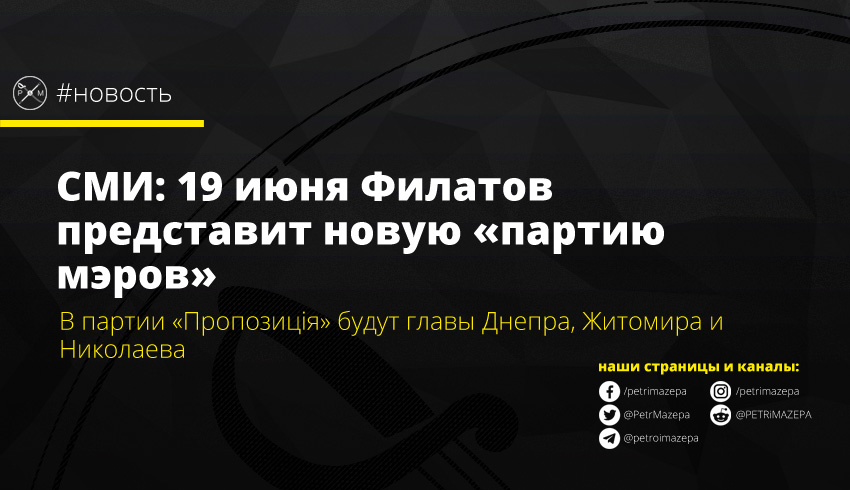 В пятницу, 19 июня, в Киеве планируют представить новую партию «Пропозиція», которая объединит городских голов нескольких городов. Согласно данным СМИ строится она вокруг мэра Днепра Бориса Филатова и в ней не примут участия ни Кличко, ни Садовой, ни Кернес, ни Труханов.