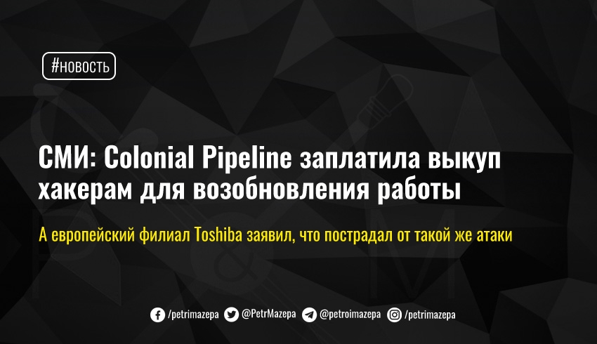 Ряд американских СМИ (CNN, New York Times, Bloomberg и Wall Street Journal) сообщили, что нефтепровод США Colonial Pipeline, на который 8 мая совершили кибератаку, заплатил группировке DarkSide выкуп почти пять миллионов долларов.