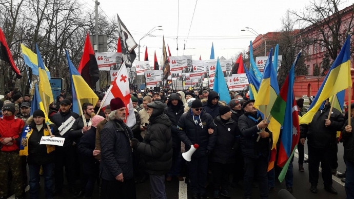 Тем временем сам Саакашвили сотоварищи проводит в Киеве «Марш за импичмент». Колонна с ним во главе прошла по бульвару Шевченко, скандируя «Киев, вставай!», «Банду геть!» и прочие весьма патриотические лозунги.