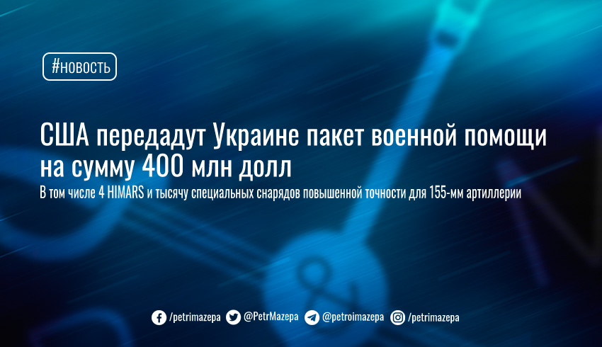 США приняли решение направить Украине очередной пакет военной помощи, который включает оборудование и боеприпасы на сумму 400 млн долл. Новый пакет помощи предназначен для поддержки Украины, которая противостоит беспрерывным артиллерийским обстрелам со стороны российских военных.