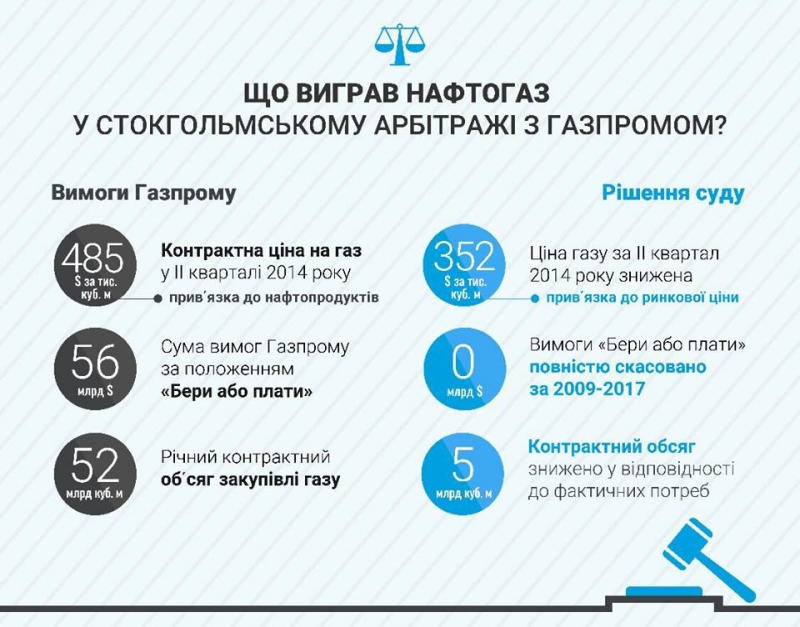 На своей официальной странице в Facebook «Нафтогаз України» озвучил краткий перечень фактов из решения Стокгольмского арбитража. По всем спорным вопросам «Нафтогаз» выиграл арбитраж против «Газпрома».