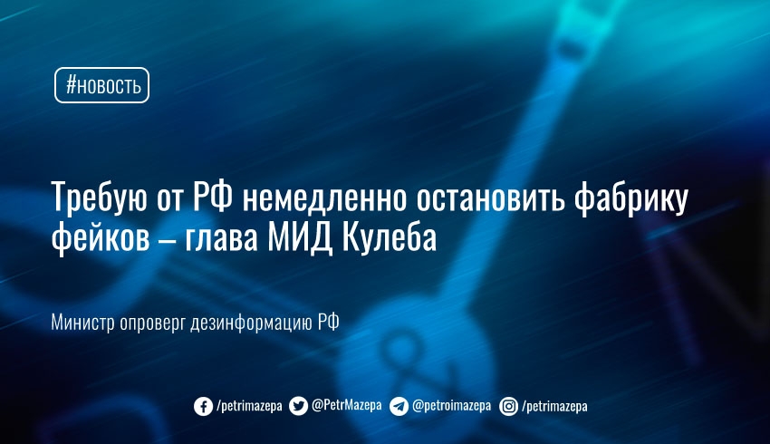 «Требую от РФ немедленно остановить фабрику фейков» - отметил Кулеба в Twitter. Он также продублировал этот посыл и на английском.