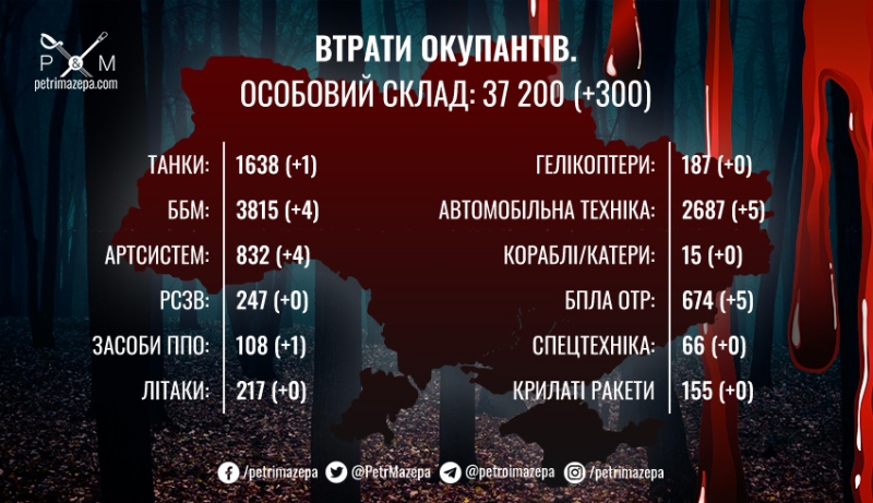 Обновленные данные Генштаба об ориентировочных потерях противника. В раздел «хороших русских» перешли 300 оккупантов. Хотя по технике не густо. Основным вчера было Краматорское направление