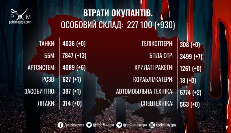 Началась 490-е сутки широкомасштабной вооруженной агрессии российской федерации против нашего государства. Сегодня ночью российские оккупанты нанесли очередной удар — применили «Shahed-136/131». Также за прошедшие сутки российские захватчики нанесли удар по территории Украины 5 крылатыми ракетами Х-22 и 2 ЗКР из С-300, нанесли 24 авиационных удара и осуществили 42 обстрела из РСЗО.