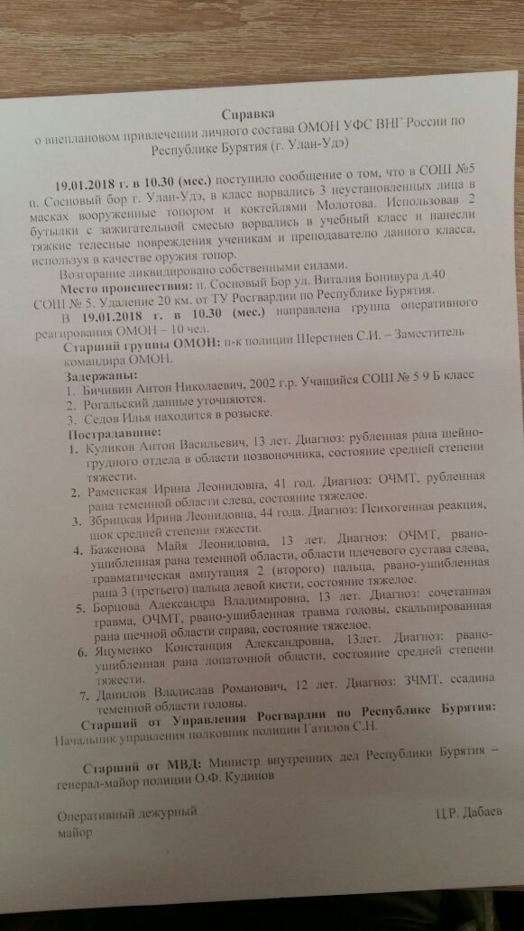 Вообще, сведения о количестве нападавших в разных источниках отличаются. Власти Бурятии изначально сообщали о троих, «Интерфакс» пишет, что подростков было двое, а Следственный комитет России утверждает, что нападавший был всего один, и он уже задержан – вернее, под конвоем доставлен в больницу.