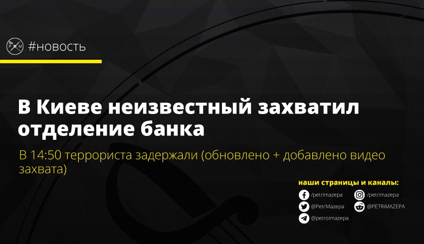 В Киеве захвачено помещение «Универсал Банка» - злоумышленник заявляет что у него в рюкзаке находится взрывное устройство. В помещении остается руководительница отделения. Введена в действие полицейская операция «Гром».