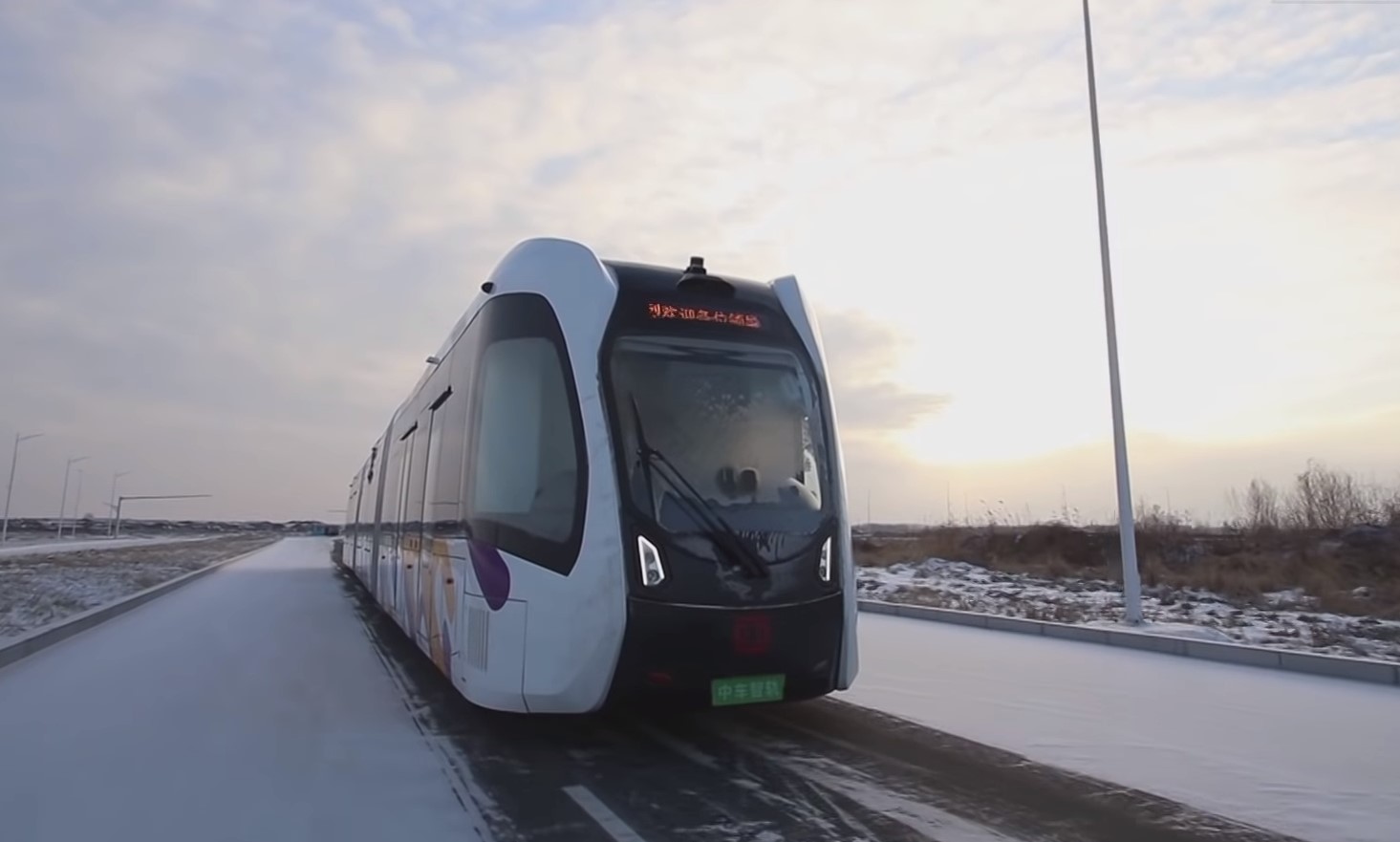 В китайском Харбине протестировали первый в мире безрельсовый поезд. Испытания прошли в самой северной провинции КНР Хэйлунцзян. Длина электропоезда с виртуальными рельсами более 30 метров, вместимость – около 300 пассажиров.