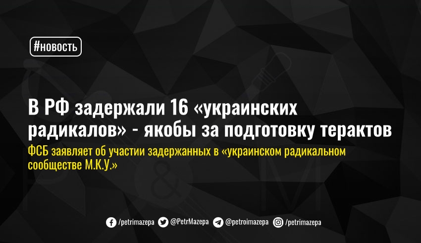 «В городах Иркутске, Краснодаре, Саратове, Тамбове, Тюмени, Чите, Анапе Краснодарского края, Пущино Московской области, Переславль-Залесском Ярославской области задержаны 16 сторонников украинского молодежного радикального сообщества «М.К.У.», причастных к совершению насильственных преступлений, пропаганде экстремизма, а также подготовке подрывов административных зданий органов власти и вооруженных нападений на граждан», - сообщает ФСБ страны-агрессора.