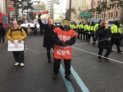 Ещё они разыграли представление в масках Чжэ Ина, Чен Ына и Дональда Трампа и попытались сжечь флаг Северной Кореи, но этому помешала полиция.