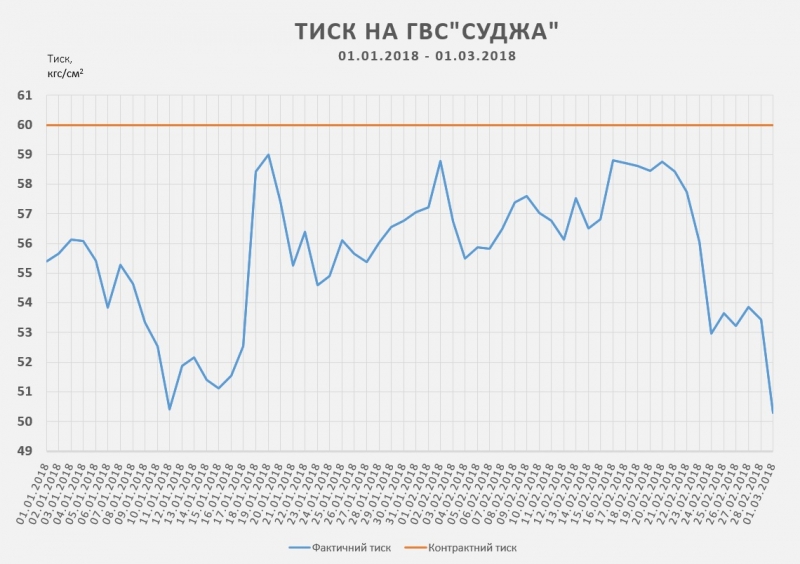 1 марта давление в транзитных магистральных газопроводах на входе в украинскую ГТС упало до наименьшего значения в этом году - 50,3 кгс/см2. Хотя по транзитному контракту предусмотрено соблюдение российской стороной давления газа в магистральных газопроводах на входной точке ГИС «Суджа» в диапазоне 60-65 кгс/см2. Но следовать букве контракта россияне разучились давно – и с начала года не было ни одного дня соблюдения прописанного давления – лучший результат «Газпрома» был 59 кгс/см2, сообщает «Укртрансгаз».