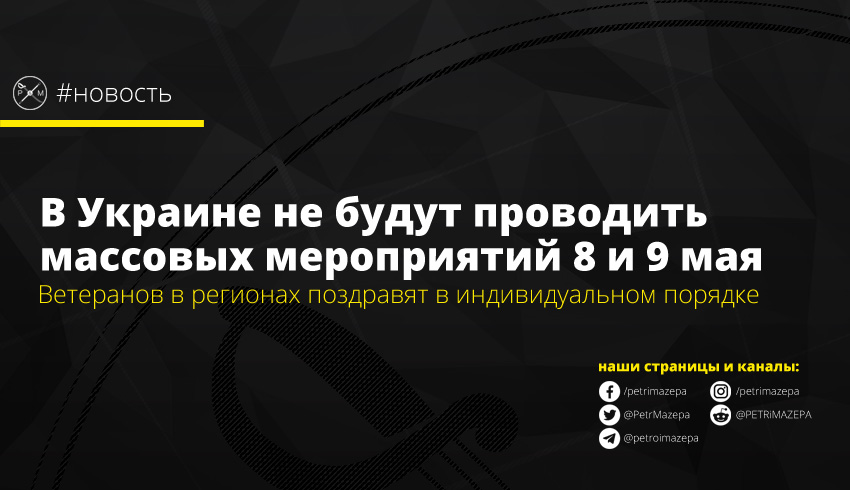 Премьер-министр Денис Шмыгаль заявил, что в связи с карантином в Украине не проводятся массовые мероприятия и, чтобы не подвергать риску украинцев, 8 и 9 мая не станут исключением. «Мы не будем проводить в этом году массовых мероприятий», - передает слова премьера «Украинская правда».