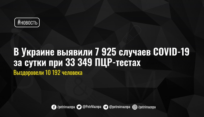 В Украине выявили 7 925 случаев COVID-19 за сутки при 33 349 ПЦР-тестах