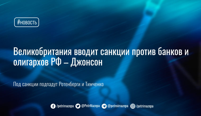 Премьер-министр Великобритании Борис Джонсон объявил список санкций из-за признания Россией оккупированных районов Донецкой и Луганской областей как «республик». Под удар попадут пять российских банков, а также персонально олигархи и друзья Путина – братья Ротенберги и Геннадий Тимченко.