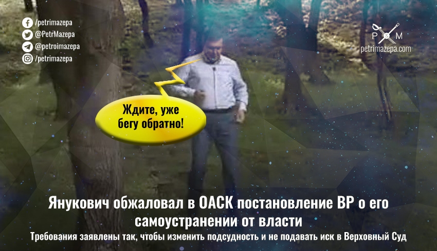 В Окружном административном суде Киева зарегистрирован иск Виктора Януковича, которым тот пытается обжаловать постановление Верховной Рады о его самоустранении с должности президента. Причем делает он это интересным способом – требуя «признать отсутствие компетенции установления факта самоустранения», что по мнению представителя Рады в КСУ Ольги Совгири сделано намеренно для изменения подсудности.