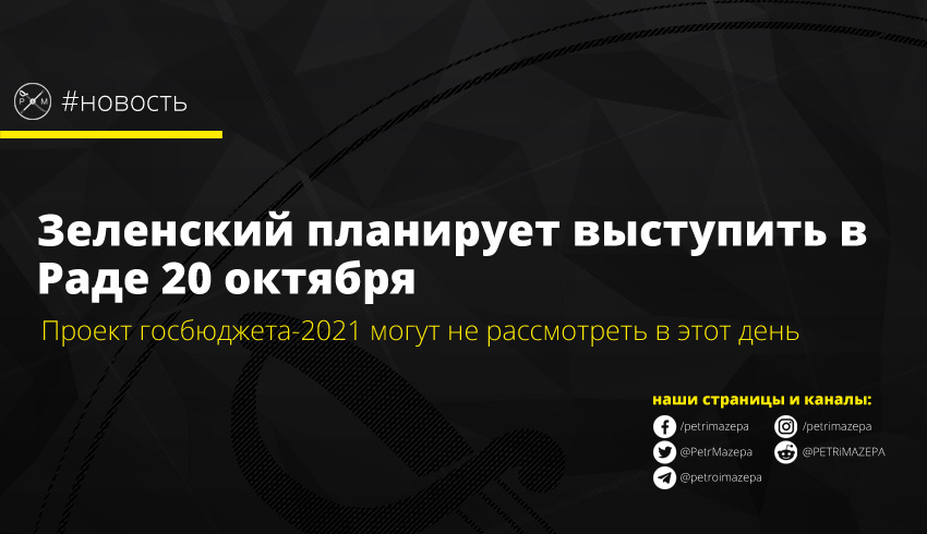Первый заместитель главы налогового комитета Железняк («Голос») в Telegram написал, что вместо голосования по бюджету, 20 октября, будет обращение президента Владимира Зеленского к Верховной Раде. Собеседники в аппарате ВР предполагают, что выступление Зеленского еще могут отменить из-за негатива от опроса относительно 5 вопросов, который президент решил провести в день местных выборов 25 октября.