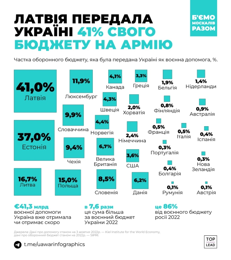 Якщо вимірювати у процентах воєнного бюджету країн-донорів, то топ-5 виглядає так: Латвія, Естонія, Литва, Люксембург, Словаччина.