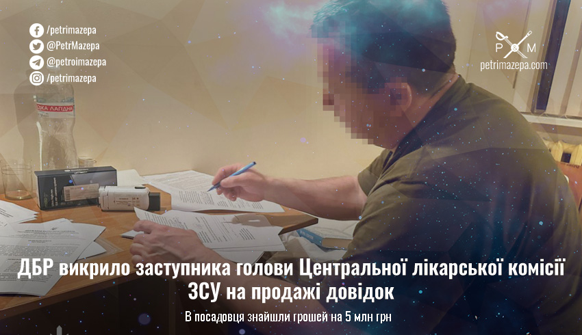 Державне бюро розслідувань викрило заступника голови Центральної військово-лікарської комісії Медичних сил ЗСУ, який організував «бізнес» по продажу довідок для військовозобов’язаних — йому вже повідомлено про підозру, вдома у посадовця знайшли грошей на 5 млн грн, їх походження встановлюється.