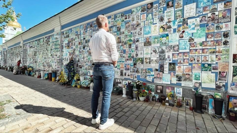 Він уже побував біля стіни полеглих захисників, яка розташована на мурах Михайлівського собору.