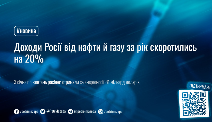 Надходження від нафти та газу до федерального бюджету Росії за дев’ять місяців цього року впали на 20,6% (у річному вимірі, тобто порівняно з аналогічним періодом минулого року).