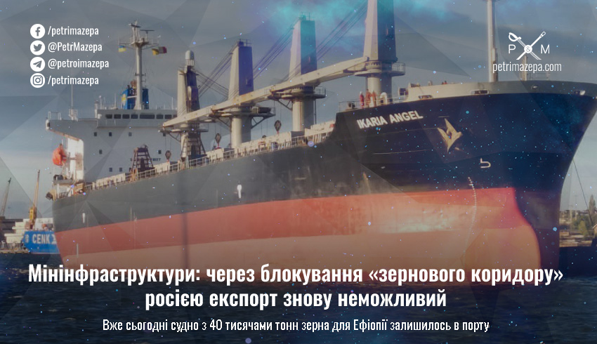 Судно Ikaria Angel з 40 тисячами тонн зерна на борту, що призначалося для Ефіопії, не змогло у неділю вийти з українського порту через блокаду, яку відновила росія після виходу із «зернової угоди», написав у Twitter міністр інфраструктури Олександр Кубраков.