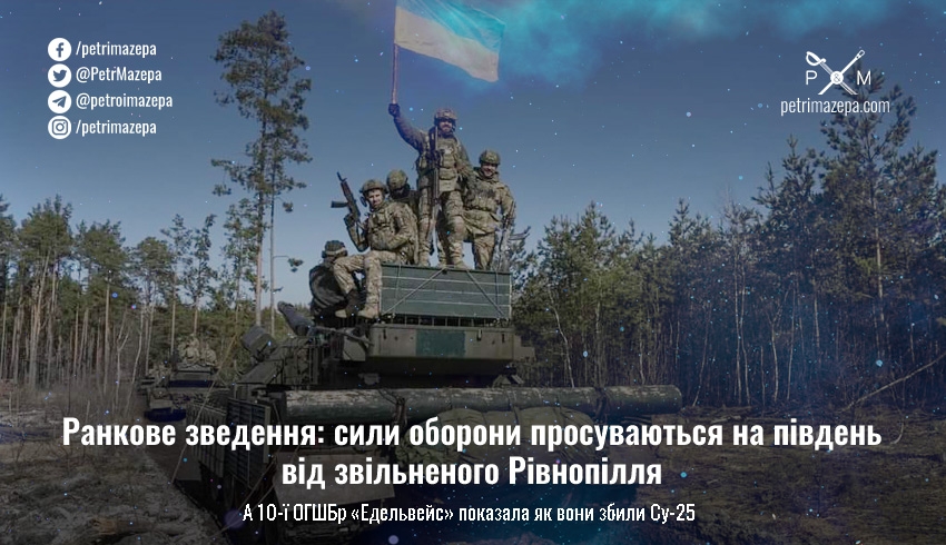 Ранкове зведення: сили оборони просуваються на південь від звільненого Рівнопілля