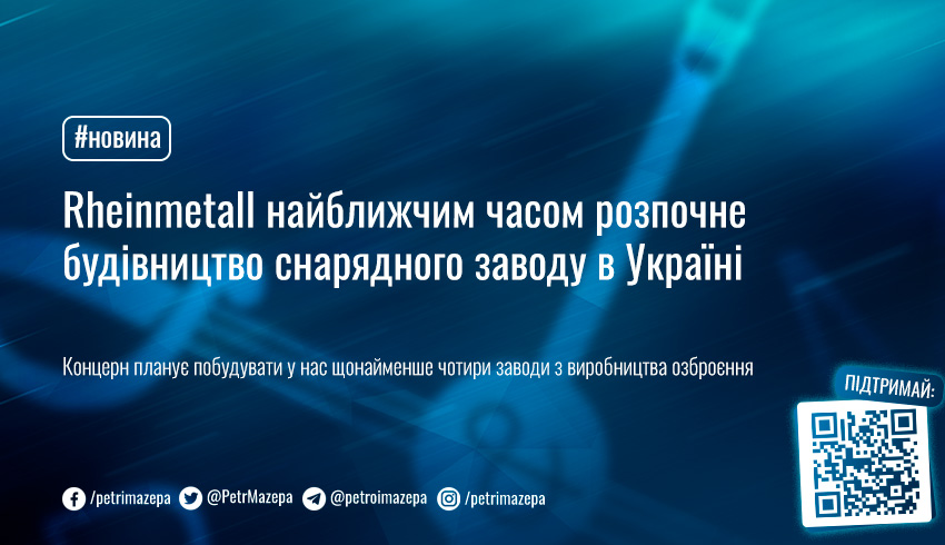 Підготовка до будівництва нового заводу з виробництва боєприпасів в Україні завершується, церемонія закладки відбудеться «незабаром». Голова правління Rheinmetall Армін Папперґер зазначив, що перші снаряди можуть зійти з конвеєра в Україні за 15 місяців.