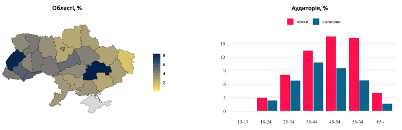Якщо на початку року найбільше політичної реклами таргетувалося на користувачів з Києва, то далі ця тенденція змінилася. Кияни (11,5%) залишилися серед найбажаніших отримувачів рекламного контенту, але поступилися першістю жителям Дніпропетровщини (16,7%). Окрім того, рекламодавці при визначенні географічних налаштувань показів політичної реклами віддавали перевагу мешканцям Львівської (8,7%), Вінницької (5,3%), Полтавської (5,2%), Тернопільської (5%) областей. Вже традиційно найменше реклами в розрізі регіонів України було таргетовано на перегляди користувачами з Луганської області (0,7%).