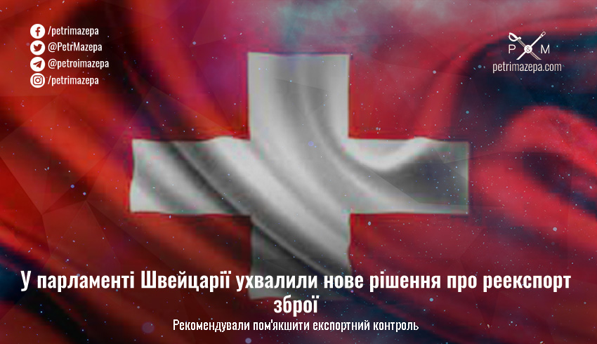 Комісія Ради кантонів Федеральних зборів, верхньої палати парламенту Швейцарії рекомендувала пом'якшити експортний контроль швейцарської військової техніки, від чого потенційно в майбутньому може отримати користь Україна. Наразі комітет із безпекової політики Національної ради має розробити відповідний законопроект. У парламенті прогнозують, що якщо процедура схвалення реекспорту зброї завершиться позитивно, то рішення реально зможе набути чинності навесні наступного року.