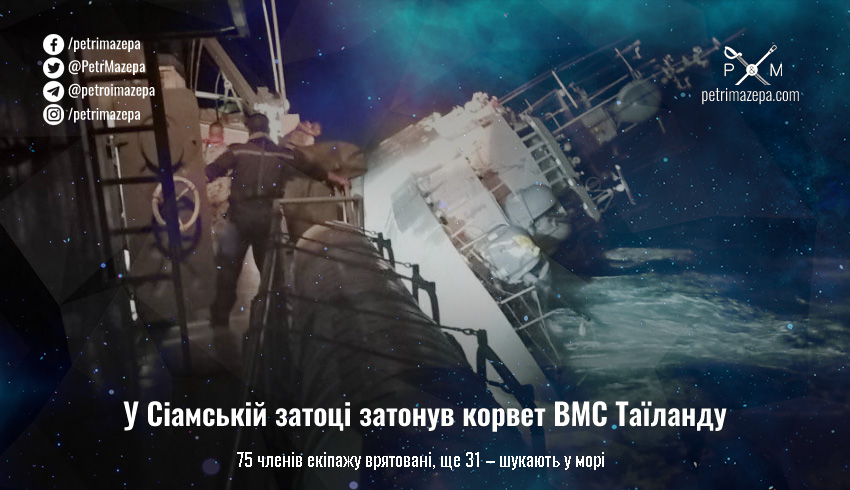 Під час шторму в Сіамській затоці у Південнокитайському морі затонув корвет військово-морських сил Таїланду HTMS Sukhothai. На борту перебували понад сотня членів екіпажу: 75-х вдалось врятувати майже зразу, ще 31 - вважаються зниклими безвісти
