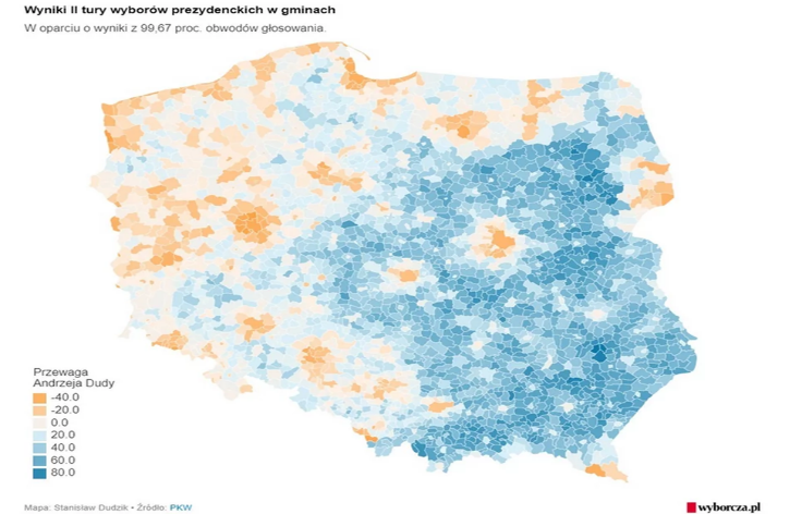 Великий градус емоційного напруження та поляризації польського суспільства напередодні президентських виборів був помітний навіть із Києва. Розпач окремих прихильників опозиції після програшу Р.Тшасковського часом зашкалював, поширювалися емоційні заклики до однодумців бойкотувати продукцію, не їздити на відпочинок до тих регіонів, мешканці яких підтримали А.Дуду. Знову активізувалися розмови про історичну Польщу А та Польщу В (до речі, як наслідки вже згаданих поділів першої Речі Посполитої), були притягнуті карти з візуальною аналогією територіального розподілу голосів до ФРН та НДР за часів СРСР.