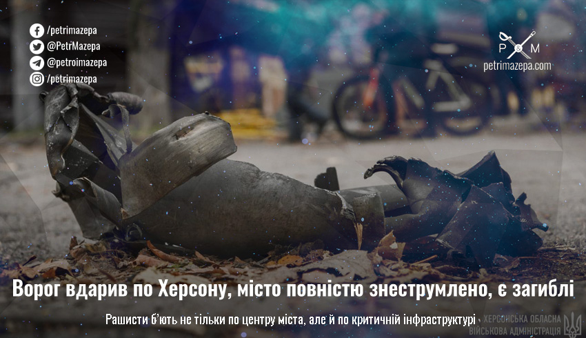Ворог знову обстріляв центр Херсона — відомо про двох загиблих. Б’є ворог і по критичній інфраструктурі, місто знову цілком знеструмлене.